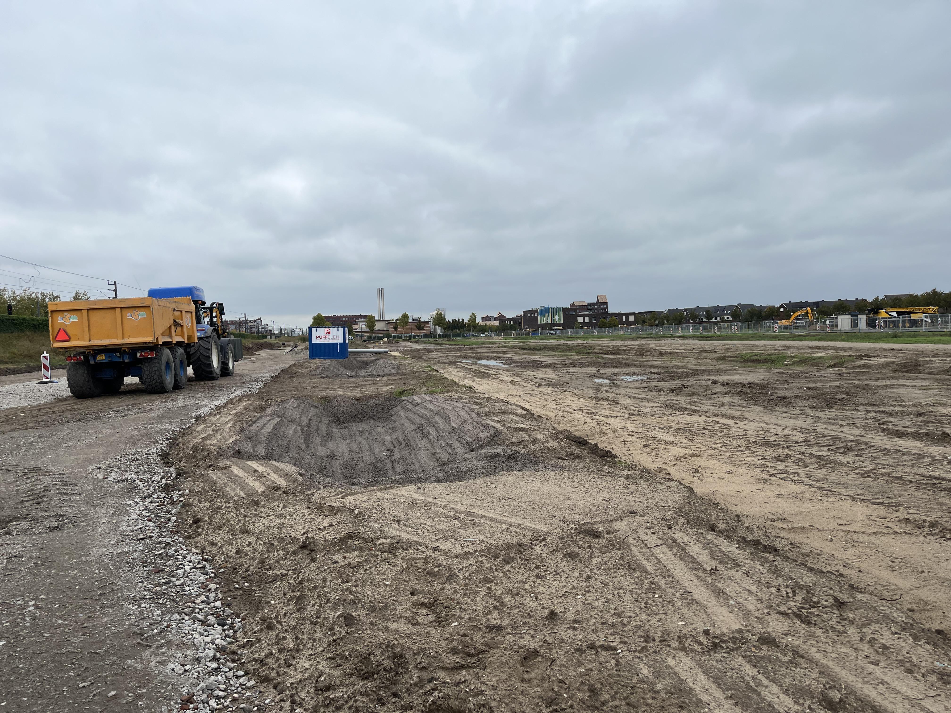 Inmiddels is de toekomstige Raaigras voorzien van de puinbaan! Een belangrijke stap in onze voorbereidingen op de bestratingswerkzaamheden. In de hoek van de Raaigras nabij het spoor, graven wij een persleiding. Het verschil tussen een ‘normale’ leiding en een persleiding is dat door een persleiding het water niet vanzelf loopt. Door middel van druk wordt het afvalwater door de persleiding gestuurd.